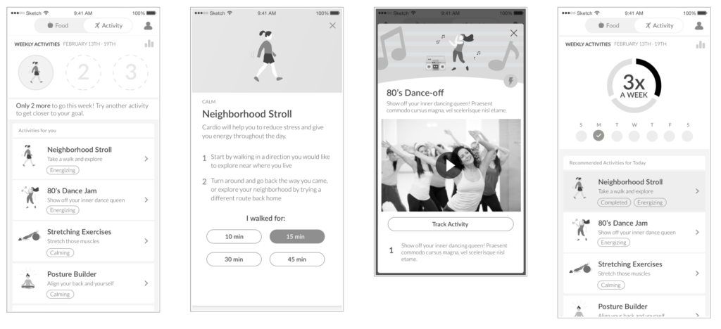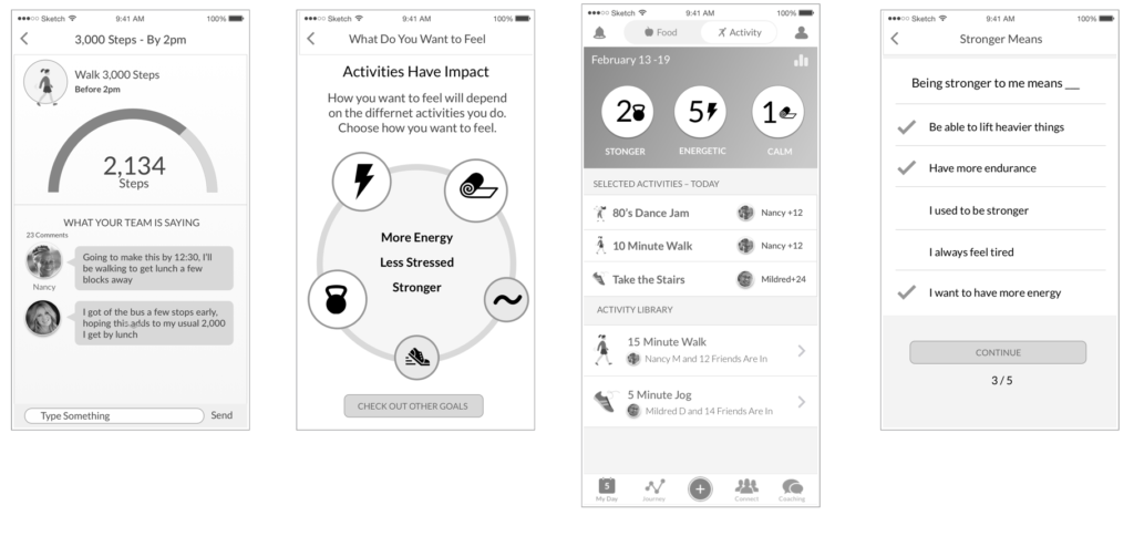 With the member journey understood, I set out to brainstorm and sketch a variety of concepts. Brainstorming with my team, we came up with a multitude of ideas and concepts, that further embraced the opportunities and learnings we had about Jennifer and her journey with activity.